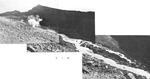 上の写真は1936年当時の1号火口(新噴火口)付近の硫黄流のようす(渡邊・下斗米1937)。1号火口はこの写真では尾根に隠れて見えていないが、白い噴煙の上がっているところの真下にある。